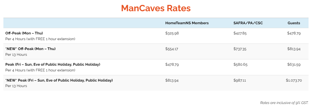 The rates for a 5 hours and 14 hours booking of the Mancaves are as follows: